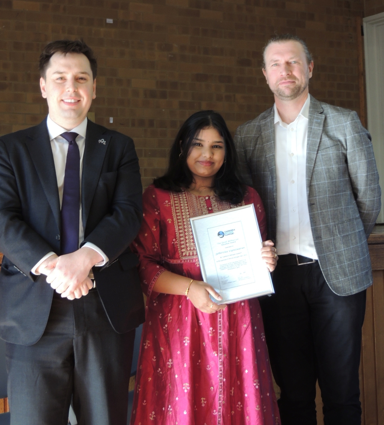 Juthi Vigneswaren receives her education award from the ACT Minister for Multicultural Affairs, Mr Michael Pettersson MLA, and Mr Mike Clayton, Senior Protection Officer UNHCR Regional Office Canberra.