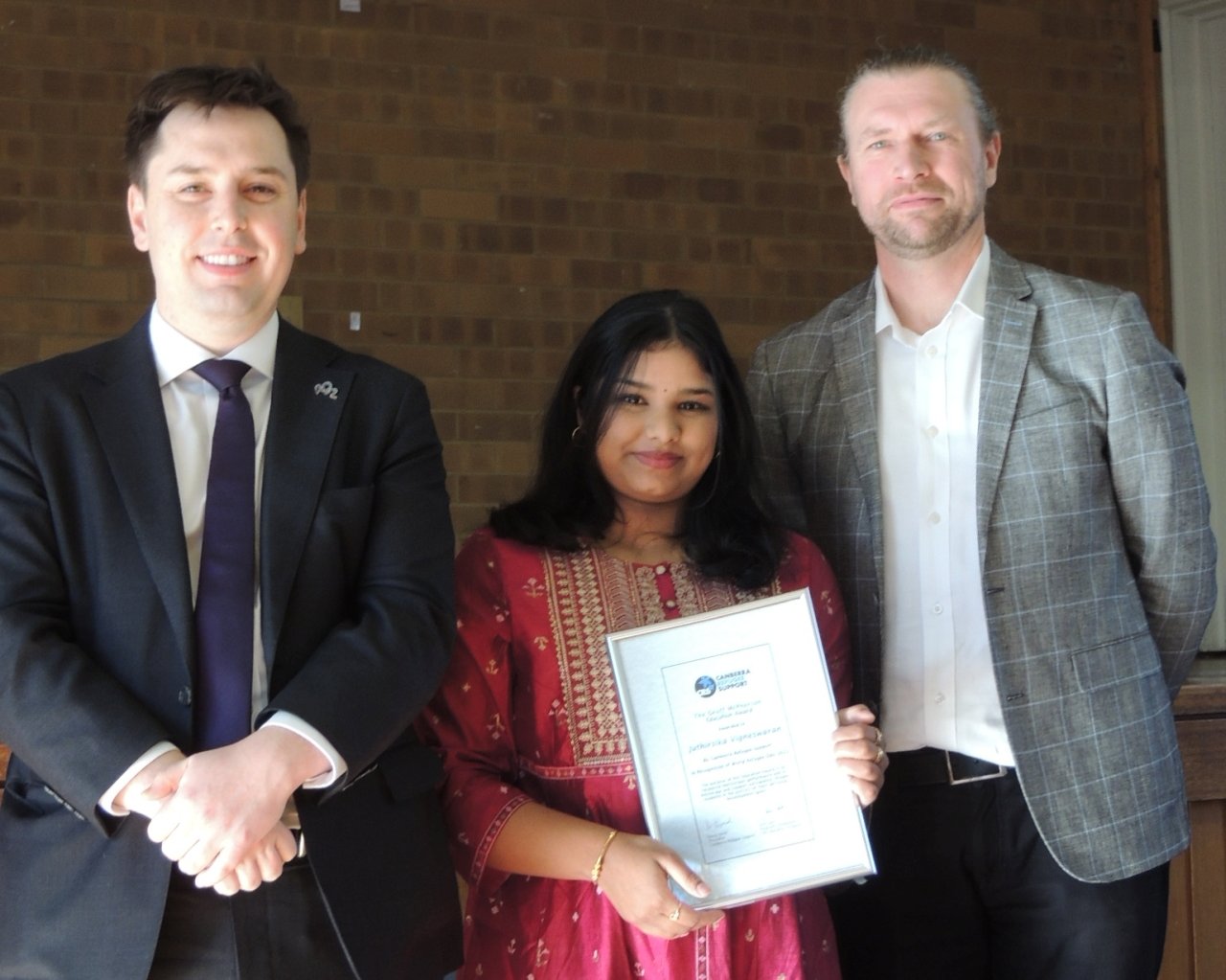 Juthi Vigneswaren receives her education award from the ACT Minister for Multicultural Affairs, Mr Michael Pettersson MLA, and Mr Mike Clayton, Senior Protection Officer UNHCR Regional Office Canberra.
